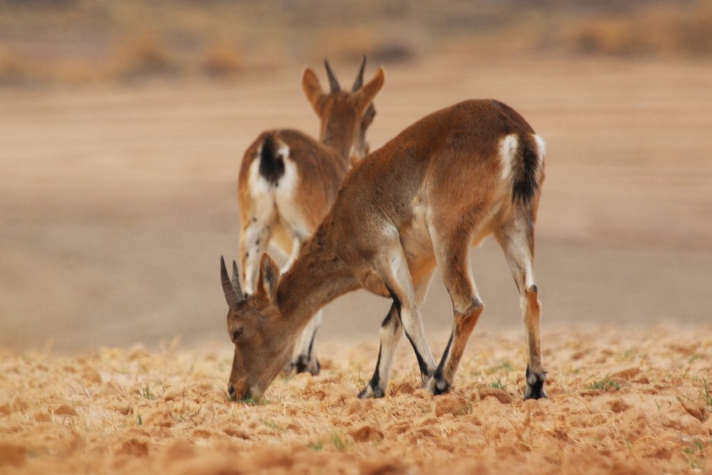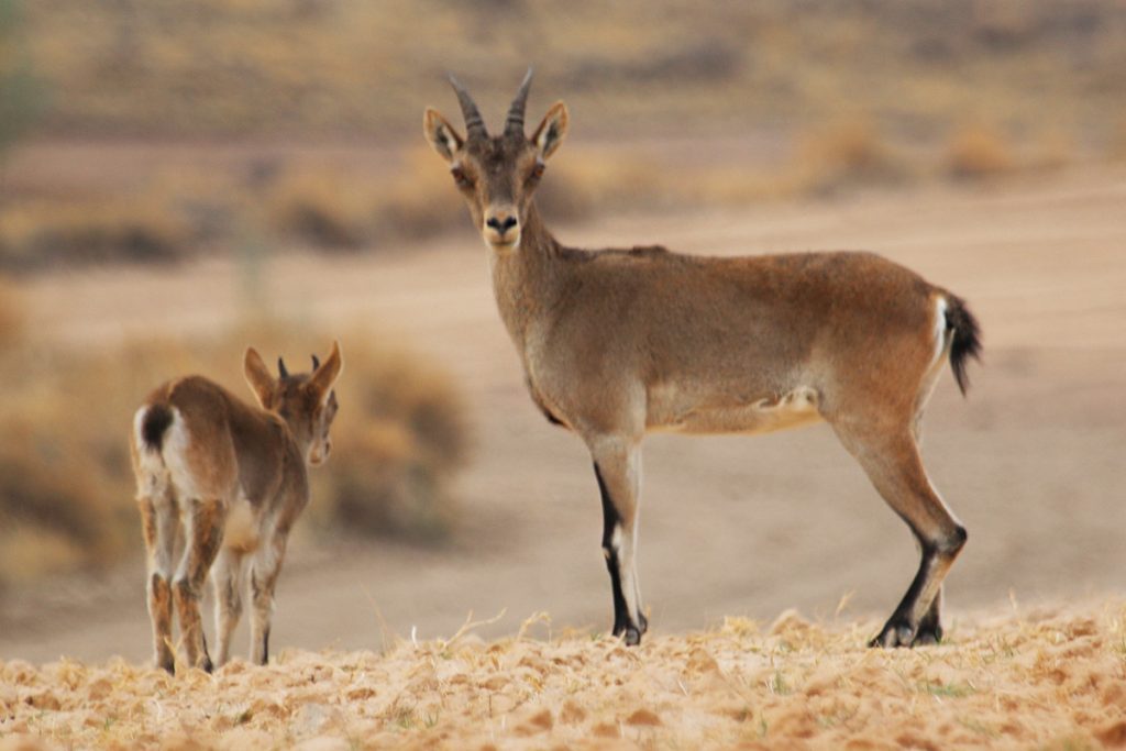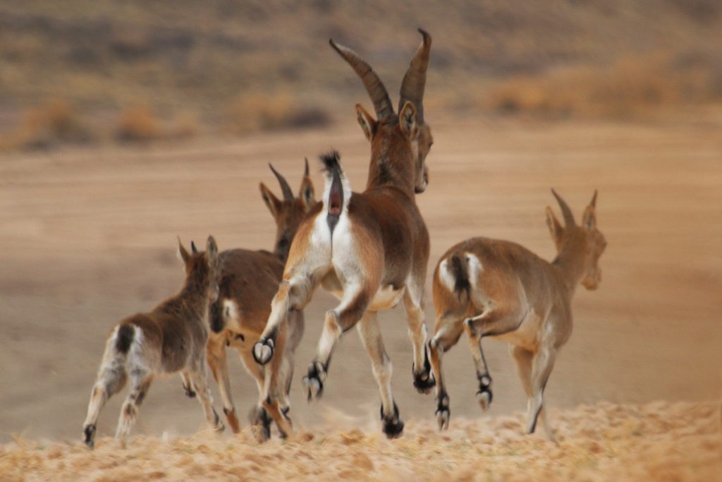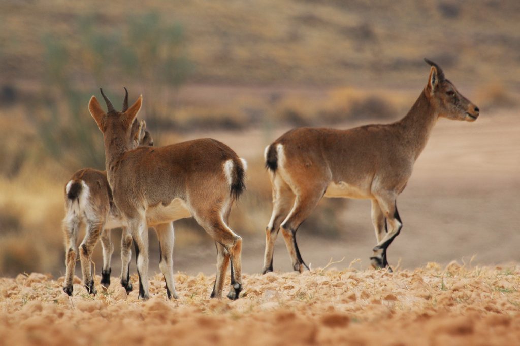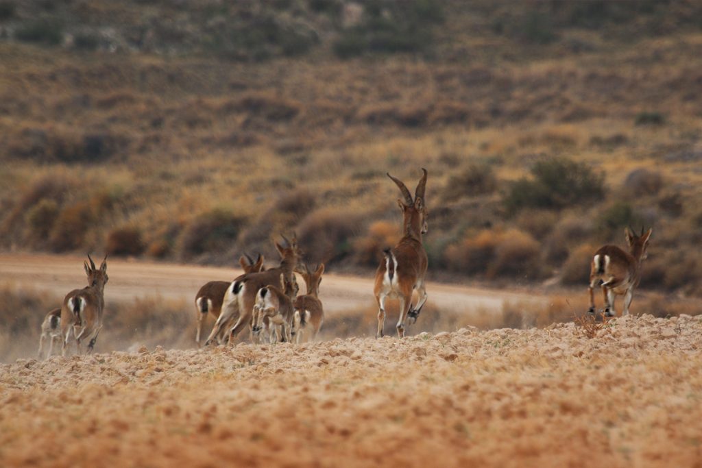 Un grupo de ocho cabras monteses (capra pyrenaica) tranquilamente pastando junto al camino de la Hiedra en Botorrita.